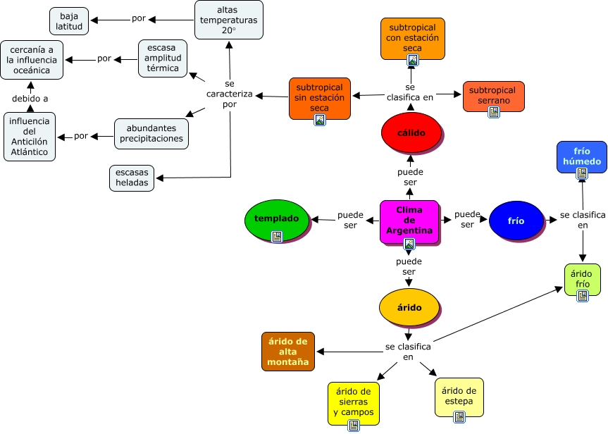 This Concept Map, created with IHMC CmapTools, has information related to: Clima de Argentina, subtropical sin estación seca se caracteriza por escasas heladas, Clima de Argentina puede ser cálido, escasa amplitud térmica por cercanía a la influencia oceánica, altas temperaturas 20° por baja latitud, subtropical sin estación seca se caracteriza por altas temperaturas 20°, árido se clasifica en árido frío, influencia del Anticilón Atlántico debido a cercanía a la influencia oceánica, árido se clasifica en árido de sierras y campos, cálido se clasifica en subtropical serrano, subtropical sin estación seca se caracteriza por abundantes precipitaciones, abundantes precipitaciones por influencia del Anticilón Atlántico, cálido se clasifica en subtropical con estación seca, subtropical sin estación seca se caracteriza por escasa amplitud térmica, árido se clasifica en árido de estepa, frío se clasifica en frío húmedo, cálido se clasifica en subtropical sin estación seca, Clima de Argentina puede ser templado, Clima de Argentina puede ser árido, frío se clasifica en árido frío, Clima de Argentina puede ser frío