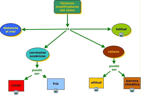 This Concept Map, created with IHMC CmapTools, has information related to: Factores modificadores del clima, corrientes oceánicas puede ser fría, Factores modificadores del clima es distancia al mar, Factores modificadores del clima es latitud, relieve puede ser barrera climática, relieve puede ser altitud, Factores modificadores del clima es corrientes oceánicas, corrientes oceánicas puede ser cálida, Factores modificadores del clima es relieve