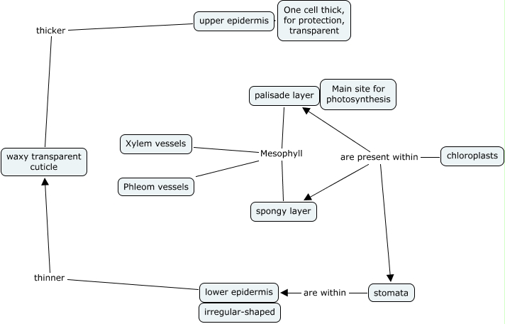 This Concept Map, created with IHMC CmapTools, has information related to: Leaf Structure, chloroplasts are present within spongy layer, Phleom vessels Mesophyll spongy layer, palisade layer Mesophyll spongy layer, lower epidermis ???? irregular-shaped, chloroplasts are present within palisade layer, Xylem vessels Mesophyll spongy layer, upper epidermis ???? One cell thick, for protection, transparent, chloroplasts are present within stomata, upper epidermis thicker waxy transparent cuticle, lower epidermis thinner waxy transparent cuticle, stomata are within lower epidermis