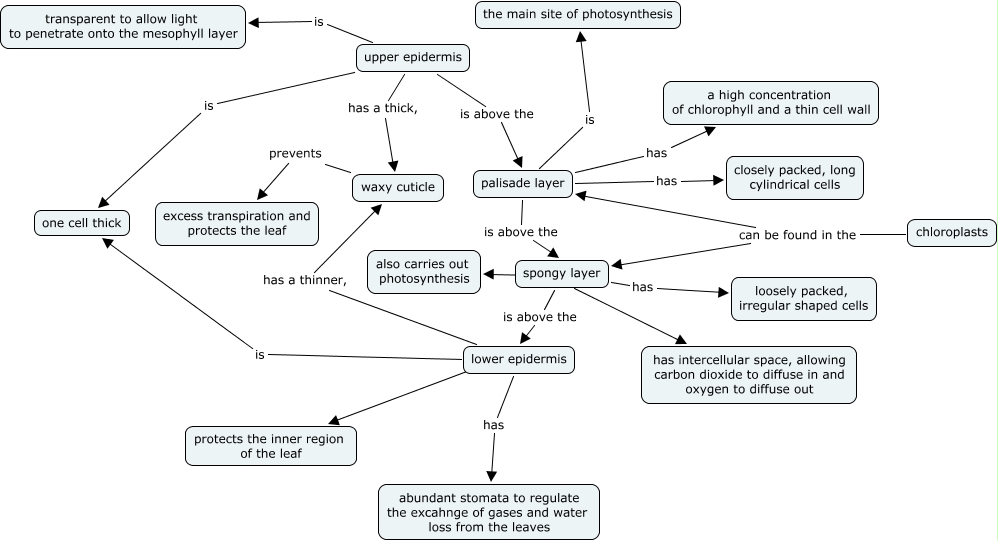 This Concept Map, created with IHMC CmapTools, has information related to: WHY's mindmap, lower epidermis has a thinner, waxy cuticle, upper epidermis is transparent to allow light to penetrate onto the mesophyll layer, upper epidermis has a thick, waxy cuticle, upper epidermis is above the palisade layer, waxy cuticle prevents excess transpiration and protects the leaf, lower epidermis has abundant stomata to regulate the excahnge of gases and water loss from the leaves, lower epidermis ???? protects the inner region of the leaf, palisade layer is above the spongy layer, palisade layer has a high concentration of chlorophyll and a thin cell wall, spongy layer has loosely packed, irregular shaped cells, chloroplasts can be found in the palisade layer, palisade layer is the main site of photosynthesis, spongy layer ???? also carries out photosynthesis, chloroplasts can be found in the spongy layer, upper epidermis is one cell thick, spongy layer is above the lower epidermis, spongy layer ???? has intercellular space, allowing carbon dioxide to diffuse in and oxygen to diffuse out, lower epidermis is one cell thick, palisade layer has closely packed, long cylindrical cells