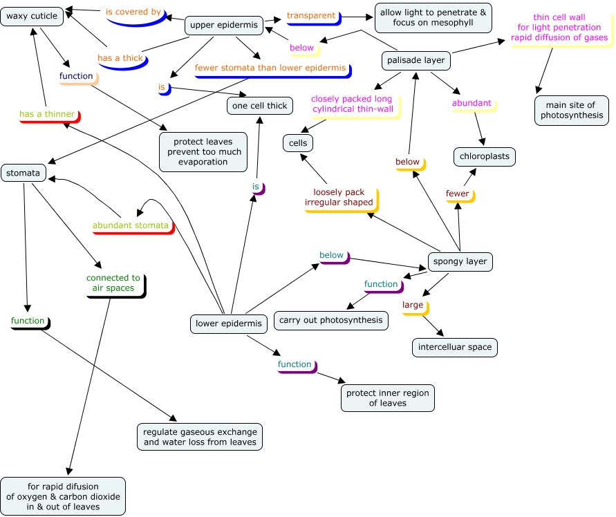 This Concept Map, created with IHMC CmapTools, has information related to: Leaf Structure 12-8, upper epidermis has a thick waxy cuticle, upper epidermis fewer stomata than lower epidermis stomata, palisade layer thin cell wall for light penetration rapid diffusion of gases main site of photosynthesis, lower epidermis abundant stomata stomata, spongy layer below palisade layer, spongy layer function carry out photosynthesis, upper epidermis transparent allow light to penetrate & focus on mesophyll, lower epidermis function protect inner region of leaves, spongy layer loosely pack irregular shaped cells, palisade layer abundant chloroplasts, stomata function regulate gaseous exchange and water loss from leaves, palisade layer below upper epidermis, stomata connected to air spaces for rapid difusion of oxygen & carbon dioxide in & out of leaves, lower epidermis below spongy layer, upper epidermis is covered by waxy cuticle, lower epidermis has a thinner waxy cuticle, spongy layer fewer chloroplasts, spongy layer large intercelluar space, waxy cuticle function protect leaves prevent too much evaporation, upper epidermis is one cell thick