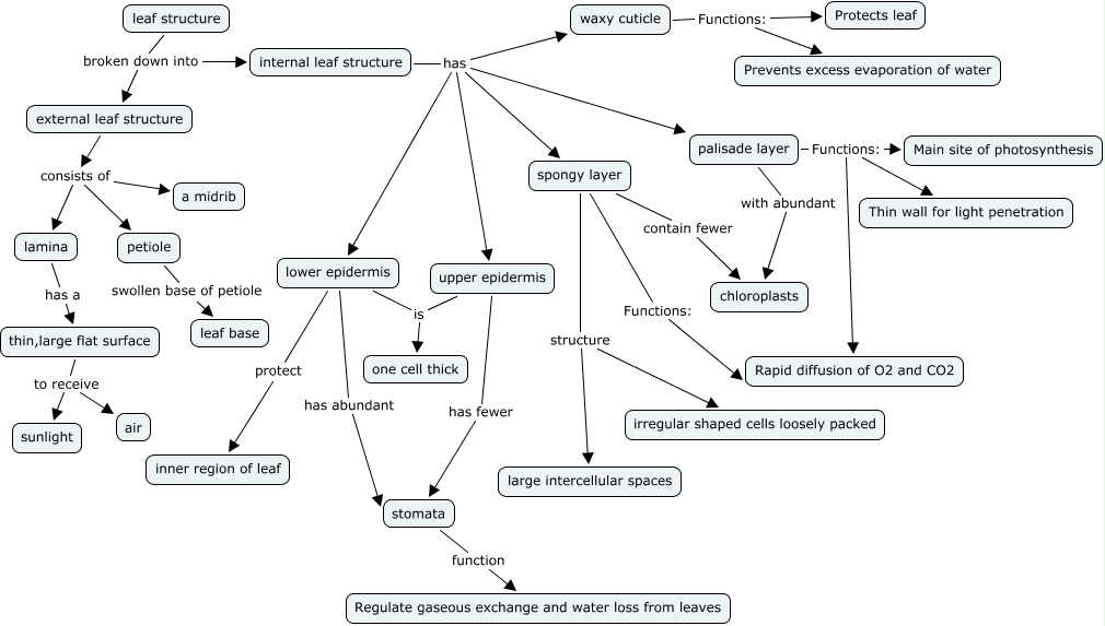 This Concept Map, created with IHMC CmapTools, has information related to: Leaf Structure 2-18, external leaf structure consists of petiole, lamina has a thin,large flat surface, stomata function Regulate gaseous exchange and water loss from leaves, internal leaf structure has upper epidermis, lower epidermis is one cell thick, internal leaf structure has lower epidermis, lower epidermis protect inner region of leaf, waxy cuticle Functions: Protects leaf, waxy cuticle Functions: Prevents excess evaporation of water, thin,large flat surface to receive sunlight, palisade layer Functions: Rapid diffusion of O2 and CO2, spongy layer contain fewer chloroplasts, thin,large flat surface to receive air, upper epidermis has fewer stomata, internal leaf structure has spongy layer, leaf structure broken down into internal leaf structure, spongy layer structure large intercellular spaces, external leaf structure consists of lamina, palisade layer Functions: Thin wall for light penetration, upper epidermis is one cell thick