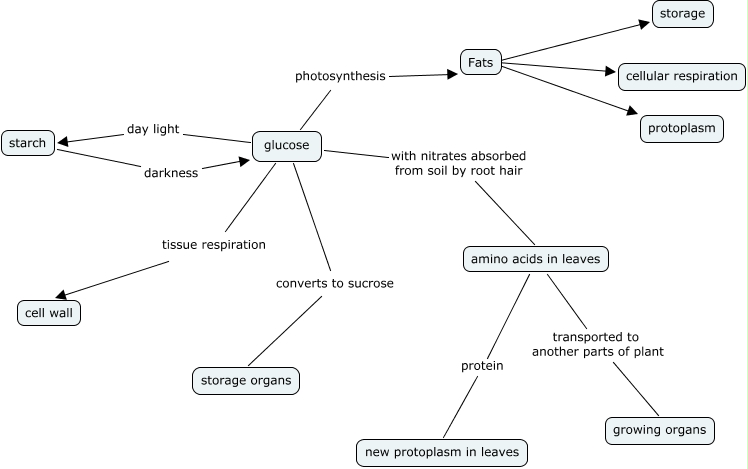 This Concept Map, created with IHMC CmapTools, has information related to: Fate of Glucose13-15, glucose day light starch, starch darkness glucose, glucose converts to sucrose storage organs, glucose photosynthesis Fats, amino acids in leaves transported to another parts of plant growing organs, Fats ???? storage, glucose tissue respiration cell wall, glucose with nitrates absorbed from soil by root hair amino acids in leaves, amino acids in leaves protein new protoplasm in leaves, Fats ???? cellular respiration, Fats ???? protoplasm