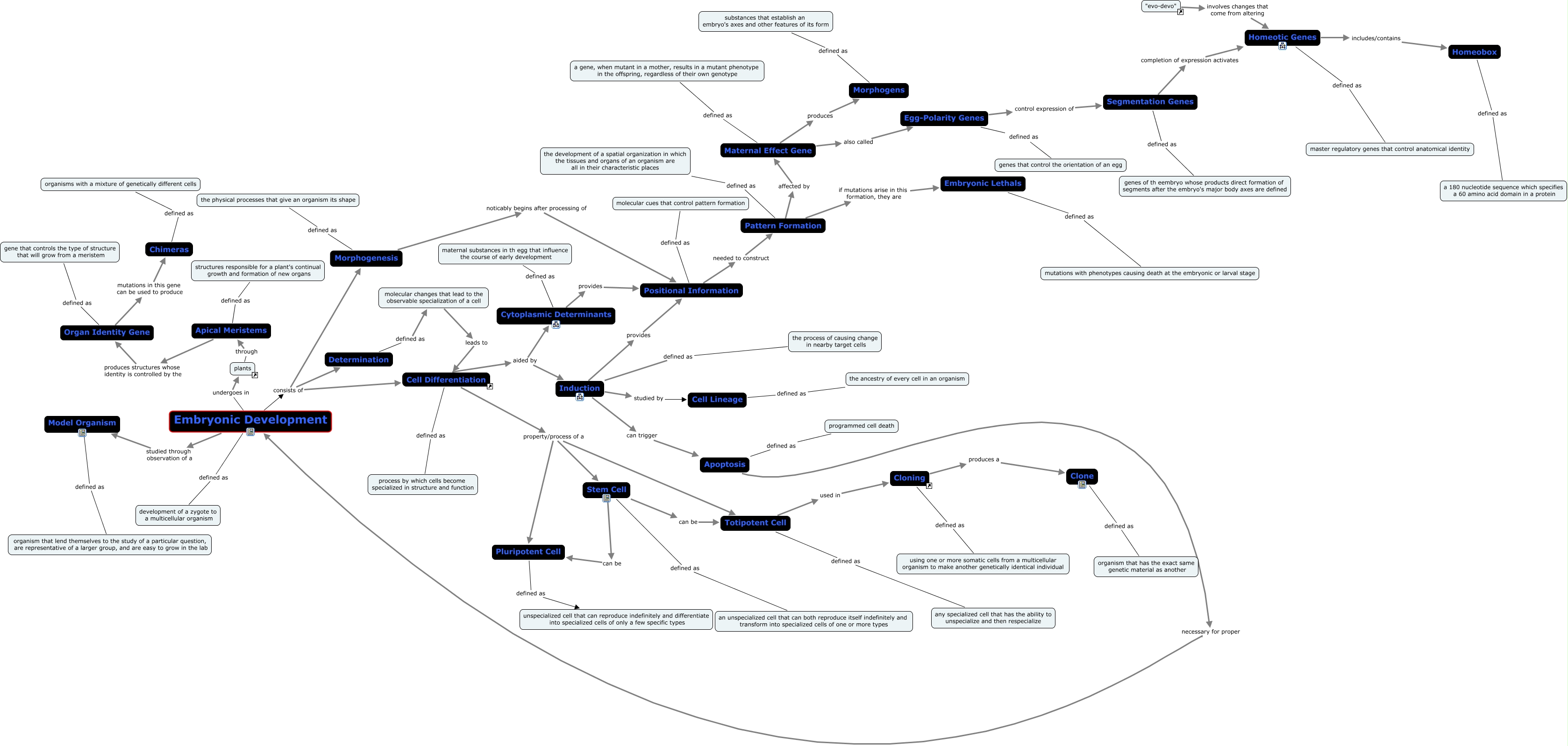 This Concept Map, created with IHMC CmapTools, has information related to: Chapter 21, Cell Lineage defined as the ancestry of every cell in an organism, Determination defined as molecular changes that lead to the observable specialization of a cell, Segmentation Genes completion of expression activates Homeotic Genes, Chimeras defined as organisms with a mixture of genetically different cells, Induction can trigger Apoptosis, Cell Differentiation aided by Cytoplasmic Determinants, Stem Cell can be Pluripotent Cell, Organ Identity Gene mutations in this gene can be used to produce Chimeras, Cloning defined as using one or more somatic cells from a multicellular organism to make another genetically identical individual, Egg-Polarity Genes control expression of Segmentation Genes, Embryonic Development studied through observation of a Model Organism, Totipotent Cell used in Cloning, Induction studied by Cell Lineage, Stem Cell defined as an unspecialized cell that can both reproduce itself indefinitely and transform into specialized cells of one or more types, Cytoplasmic Determinants provides Positional Information, Embryonic Lethals defined as mutations with phenotypes causing death at the embryonic or larval stage, Positional Information needed to construct Pattern Formation, Organ Identity Gene defined as gene that controls the type of structure that will grow from a meristem, Positional Information defined as molecular cues that control pattern formation, Embryonic Development defined as development of a zygote to a multicellular organism