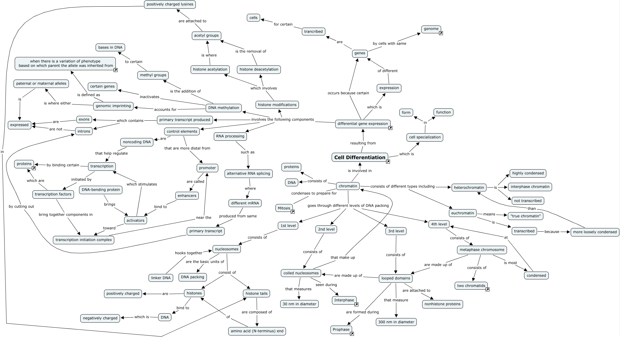 This Concept Map, created with IHMC CmapTools, has information related to: Chapter 19 Kelsey 2, primary transcript produced which contains introns, differential gene expression occurs because certain genes, different mRNA produced from same primary transcript, exons are expressed, transcription factors which are proteins, transcribed because more loosely condensed, genomic imprinting is where either paternal or maternal alleles, chromatin goes through different levels of DNA packing 2nd level, methyl groups to certain bases in DNA, condensed at 4th level, transcription by binding certain proteins, genes are trancribed, 1st level consists of nucleosomes, chromatin goes through different levels of DNA packing 1st level, DNA methylation accounts for genomic imprinting, DNA which is negatively charged, looped domains are made up of coiled nucleosomes, promoter are called enhancers, chromatin consists of different types including euchromatin, more loosely condensed than heterochromatin
