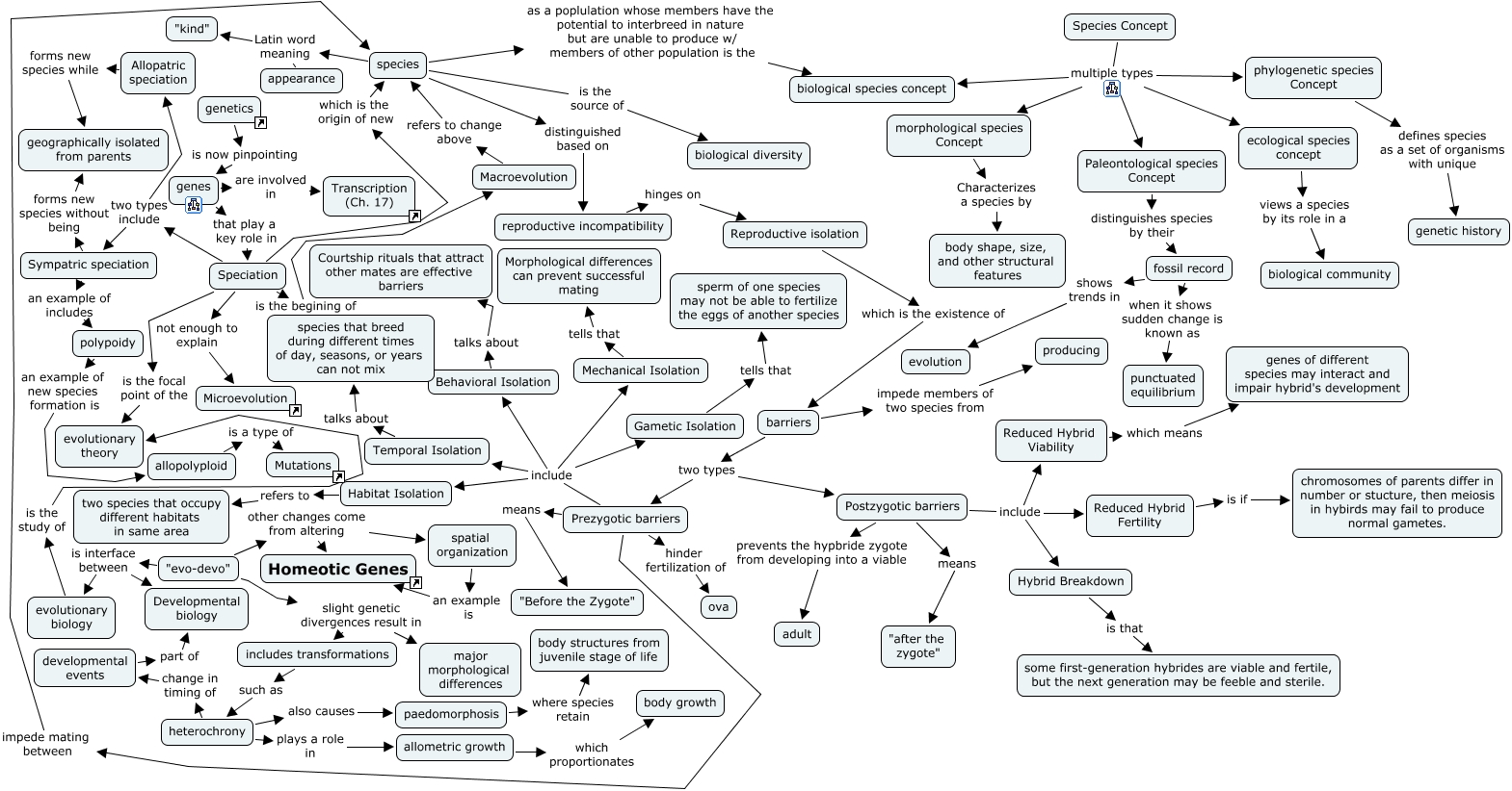 This Concept Map, created with IHMC CmapTools, has information related to: linked chapter 24 - Jeff, Prezygotic barriers means "Before the Zygote", Hybrid Breakdown is that some first-generation hybrides are viable and fertile, but the next generation may be feeble and sterile., Species Concept multiple types Paleontological species Concept, Species Concept multiple types ecological species concept, paedomorphosis where species retain body structures from juvenile stage of life, developmental events part of Developmental biology, Speciation is the focal point of the evolutionary theory, species as a poplulation whose members have the potential to interbreed in nature but are unable to produce w/ members of other population is the biological species concept, Speciation which is the origin of new species, Postzygotic barriers include Hybrid Breakdown, genes that play a key role in Speciation, Prezygotic barriers include Behavioral Isolation, Reproductive isolation which is the existence of barriers, Species Concept multiple types biological species concept, Prezygotic barriers include Gametic Isolation, barriers impede members of two species from producing, Behavioral Isolation talks about Courtship rituals that attract other mates are effective barriers, "evo-devo" slight genetic divergences result in major morphological differences, species Latin word meaning "kind", species Latin word meaning appearance
