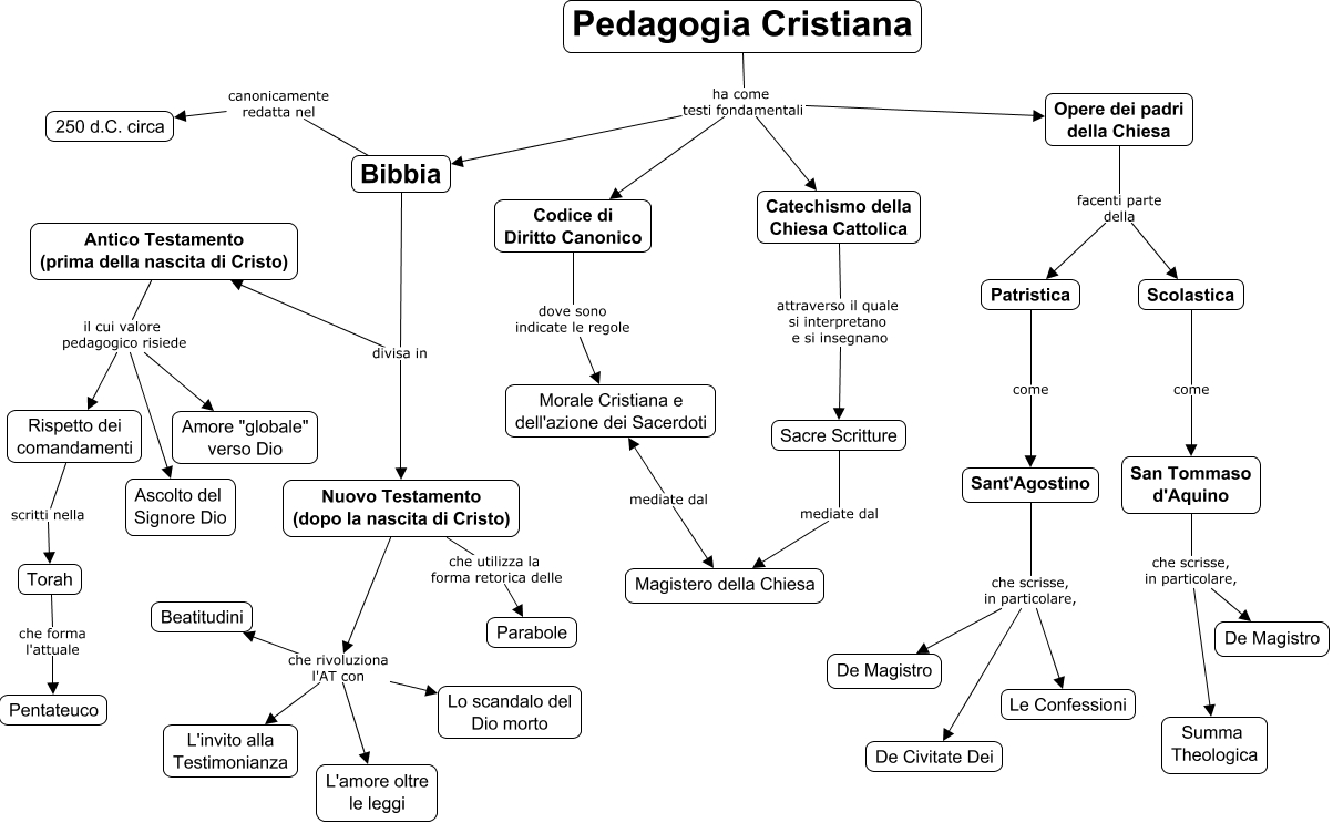 Questa Cmap, creata con IHMC CmapTools, contiene informazioni relative a: Pedagogia Cristiana, Pedagogia Cristiana ha come testi fondamentali Catechismo della Chiesa Cattolica, Patristica come Sant'Agostino, Sacre Scritture mediate dal Magistero della Chiesa, Torah che forma l'attuale Pentateuco, Scolastica come San Tommaso d'Aquino, Nuovo Testamento (dopo la nascita di Cristo) che rivoluziona l'AT con L'invito alla Testimonianza, Sant'Agostino che scrisse, in particolare, De Civitate Dei, Antico Testamento (prima della nascita di Cristo) il cui valore pedagogico risiede Rispetto dei comandamenti, Pedagogia Cristiana ha come testi fondamentali Opere dei padri della Chiesa, Antico Testamento (prima della nascita di Cristo) il cui valore pedagogico risiede Ascolto del Signore Dio, Nuovo Testamento (dopo la nascita di Cristo) che rivoluziona l'AT con Beatitudini, Catechismo della Chiesa Cattolica attraverso il quale si interpretano e si insegnano Sacre Scritture, Pedagogia Cristiana ha come testi fondamentali Bibbia, Bibbia canonicamente redatta nel 250 d.C. circa, Rispetto dei comandamenti scritti nella Torah, San Tommaso d'Aquino che scrisse, in particolare, Summa Theologica, Nuovo Testamento (dopo la nascita di Cristo) che rivoluziona l'AT con L'amore oltre le leggi, Nuovo Testamento (dopo la nascita di Cristo) che utilizza la forma retorica delle Parabole, Sant'Agostino che scrisse, in particolare, De Magistro, San Tommaso d'Aquino che scrisse, in particolare, De Magistro