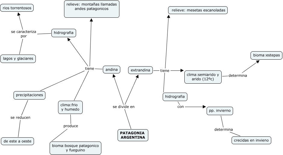 This Concept Map, created with IHMC CmapTools, has information related to: andes patagonicos a g m, extrandina tiene relieve: mesetas escanoladas, andina tiene clima:frio y humedo, clima:frio y humedo produce bioma:bosque patagonico y fueguino, pp. invierno determina crecidas en invieno, andina tiene hidrografia, andina tiene relieve: montañas llamadas andes patagonicos, PATAGONIA ARGENTINA se divide en andina, andina tiene precipitaciones, hidrografia se caracteriza por rios torrentosos, precipitaciones se reducen de este a oeste, hidrografia se caracteriza por lagos y glaciares, clima:semiarido y arido (12ºc) determina bioma:estepas, extrandina tiene clima:semiarido y arido (12ºc), PATAGONIA ARGENTINA se divide en extrandina, hidrografia con pp. invierno, extrandina tiene hidrografia
