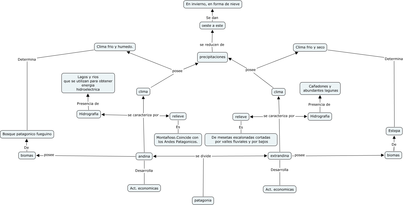 This Concept Map, created with IHMC CmapTools, has information related to: FLYT =) 4°1ra!, Hidrografia Presencia de Lagos y rios que se utilizan para obtener energia hidroelectrica, biomas De Bosque patagonico fueguino, extrandina Desarrolla Act. economicas, precipitaciones se reducen de oeste a este, andina se caracteriza por Hidrografia, andina se caracteriza por relieve, Clima frio y seco Determina Estepa, clima posee precipitaciones, Clima frio y humedo. Determina Bosque patagonico fueguino, relieve Es Montañoso.Coincide con los Andes Patagonicos., clima posee Clima frio y humedo., relieve Es De mesetas escalonadas cortadas por valles fluviales y por bajos, extrandina se caracteriza por relieve, patagonia se divide andina, oeste a este Se dan En invierno, en forma de nieve, biomas De Bosque patagonico fueguino, biomas De Estepa, Hidrografia Presencia de Cañadones y abundantes lagunas, andina posee biomas, clima posee precipitaciones