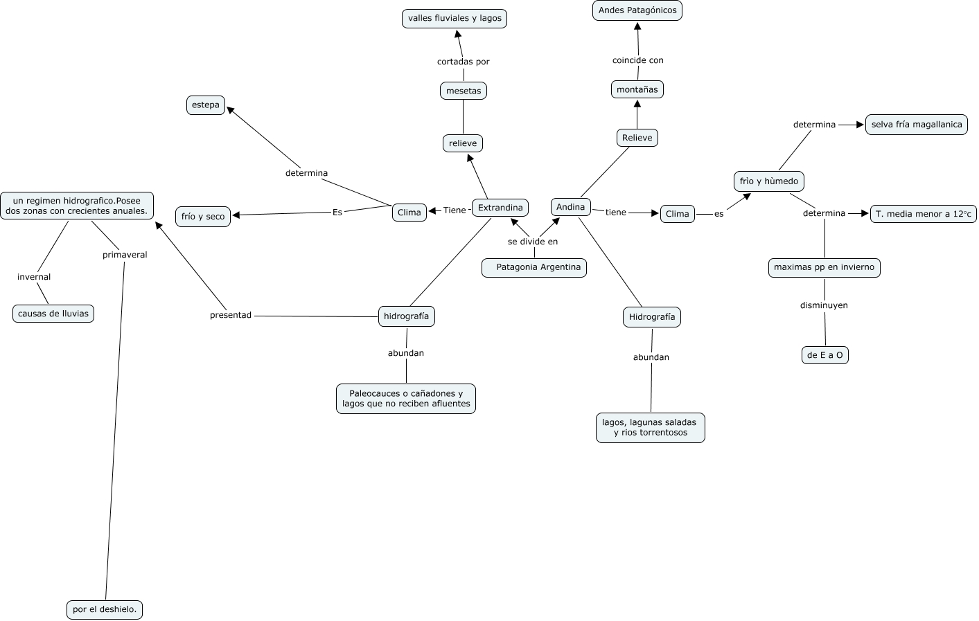This Concept Map, created with IHMC CmapTools, has information related to: patagonia jeannete, Relieve ???? montañas, hidrografía presentad un regimen hidrografico.Posee dos zonas con crecientes anuales., Andina ???? Relieve, Patagonia Argentina se divide en Andina, frìo y hùmedo determina selva fría magallanica, maximas pp en invierno disminuyen de E a O, Clima Es frío y seco, Extrandina ???? hidrografía, Hidrografía abundan lagos, lagunas saladas y rios torrentosos, frìo y hùmedo determina maximas pp en invierno, relieve ???? mesetas, mesetas cortadas por valles fluviales y lagos, frìo y hùmedo determina T. media menor a 12°c, un regimen hidrografico.Posee dos zonas con crecientes anuales. primaveral por el deshielo., Andina ???? Hidrografía, montañas coincide con Andes Patagónicos, hidrografía abundan Paleocauces o cañadones y lagos que no reciben afluentes, Clima es frìo y hùmedo, Extrandina Tiene Clima, un regimen hidrografico.Posee dos zonas con crecientes anuales. invernal causas de lluvias