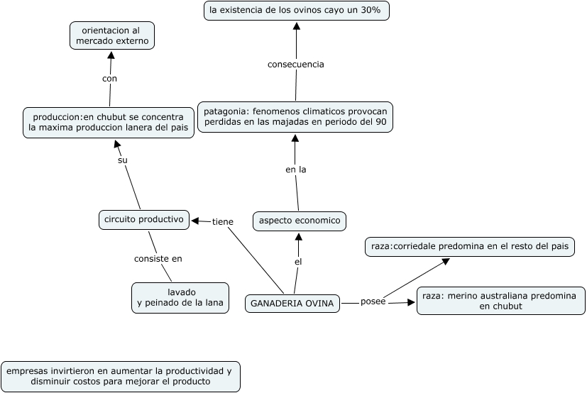 This Concept Map, created with IHMC CmapTools, has information related to: a g m, circuito productivo consiste en lavado y peinado de la lana, GANADERIA OVINA posee raza:corriedale predomina en el resto del pais, aspecto economico en la patagonia: fenomenos climaticos provocan perdidas en las majadas en periodo del 90, patagonia: fenomenos climaticos provocan perdidas en las majadas en periodo del 90 consecuencia la existencia de los ovinos cayo un 30%, produccion:en chubut se concentra la maxima produccion lanera del pais con orientacion al mercado externo, GANADERIA OVINA posee raza: merino australiana predomina en chubut, circuito productivo su produccion:en chubut se concentra la maxima produccion lanera del pais, GANADERIA OVINA tiene circuito productivo, GANADERIA OVINA el aspecto economico