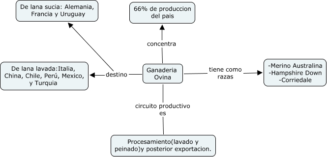 This Concept Map, created with IHMC CmapTools, has information related to: tiburones rturn, Ganaderia Ovina destino De lana lavada:Italia, China, Chile, Perú, Mexico, y Turquia, Ganaderia Ovina circuito productivo es Procesamiento(lavado y peinado)y posterior exportacion., Ganaderia Ovina tiene como razas -Merino Australina -Hampshire Down -Corriedale, Ganaderia Ovina destino De lana sucia: Alemania, Francia y Uruguay, Ganaderia Ovina concentra 66% de produccion del pais