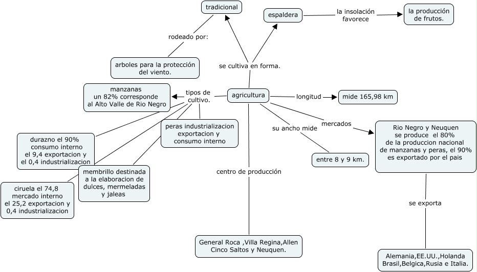 This Concept Map, created with IHMC CmapTools, has information related to: adfri, agricultura tipos de cultivo. membrillo destinada a la elaboracion de dulces, mermeladas y jaleas, Rio Negro y Neuquen se produce el 80% de la produccion nacional de manzanas y peras, el 90% es exportado por el pais se exporta Alemania,EE.UU.,Holanda Brasil,Belgica,Rusia e Italia., agricultura centro de producción General Roca ,Villa Regina,Allen Cinco Saltos y Neuquen., agricultura tipos de cultivo. ciruela el 74,8 mercado interno el 25,2 exportacion y 0,4 industrializacion, espaldera la insolación favorece la producción de frutos., agricultura tipos de cultivo. durazno el 90% consumo interno el 9,4 exportacion y el 0,4 industrializacion, agricultura tipos de cultivo. peras industrializacion exportacion y consumo interno, agricultura se cultiva en forma. tradicional, agricultura se cultiva en forma. espaldera, agricultura tipos de cultivo. manzanas un 82% corresponde al Alto Valle de Rio Negro, tradicional rodeado por: arboles para la protección del viento., agricultura mercados Rio Negro y Neuquen se produce el 80% de la produccion nacional de manzanas y peras, el 90% es exportado por el pais, agricultura longitud mide 165,98 km, agricultura su ancho mide entre 8 y 9 km.