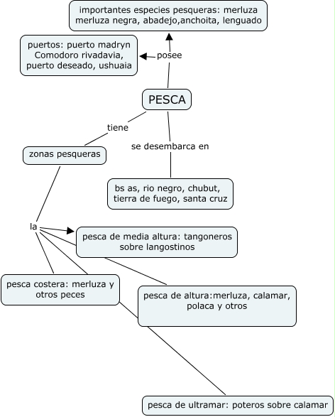 This Concept Map, created with IHMC CmapTools, has information related to: pesca, PESCA tiene zonas pesqueras, PESCA posee puertos: puerto madryn Comodoro rivadavia, puerto deseado, ushuaia, PESCA se desembarca en bs as, rio negro, chubut, tierra de fuego, santa cruz, zonas pesqueras la pesca costera: merluza y otros peces, PESCA posee importantes especies pesqueras: merluza merluza negra, abadejo,anchoita, lenguado, zonas pesqueras la pesca de media altura: tangoneros sobre langostinos, zonas pesqueras la pesca de ultramar: poteros sobre calamar, zonas pesqueras la pesca de altura:merluza, calamar, polaca y otros