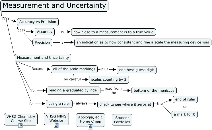 This Concept Map, created with IHMC CmapTools, has information related to: Measurement and Uncertainty, Accuracy vs Precision ???? Accuracy, using a ruler always check to see where it zeros at, Measurement and Uncertainty ???? Measurement and Uncertainty, check to see where it zeros at the end of ruler, end of ruler or a mark for 0, reading a graduated cylinder read from the bottom of the meniscus, Accuracy vs Precision ???? Precision, Accuracy is how close to a measurement is to a true value, Precision is an indication as to how consistent and fine a scale the measuring device was, Measurement and Uncertainty for using a ruler, Measurement and Uncertainty Record all of the scale markings, all of the scale markings plus one best-guess digit, all of the scale markings be careful scales counting by 2, check to see where it zeros at the a mark for 0, Measurement and Uncertainty for reading a graduated cylinder, Measurement and Uncertainty ???? Accuracy vs Precision