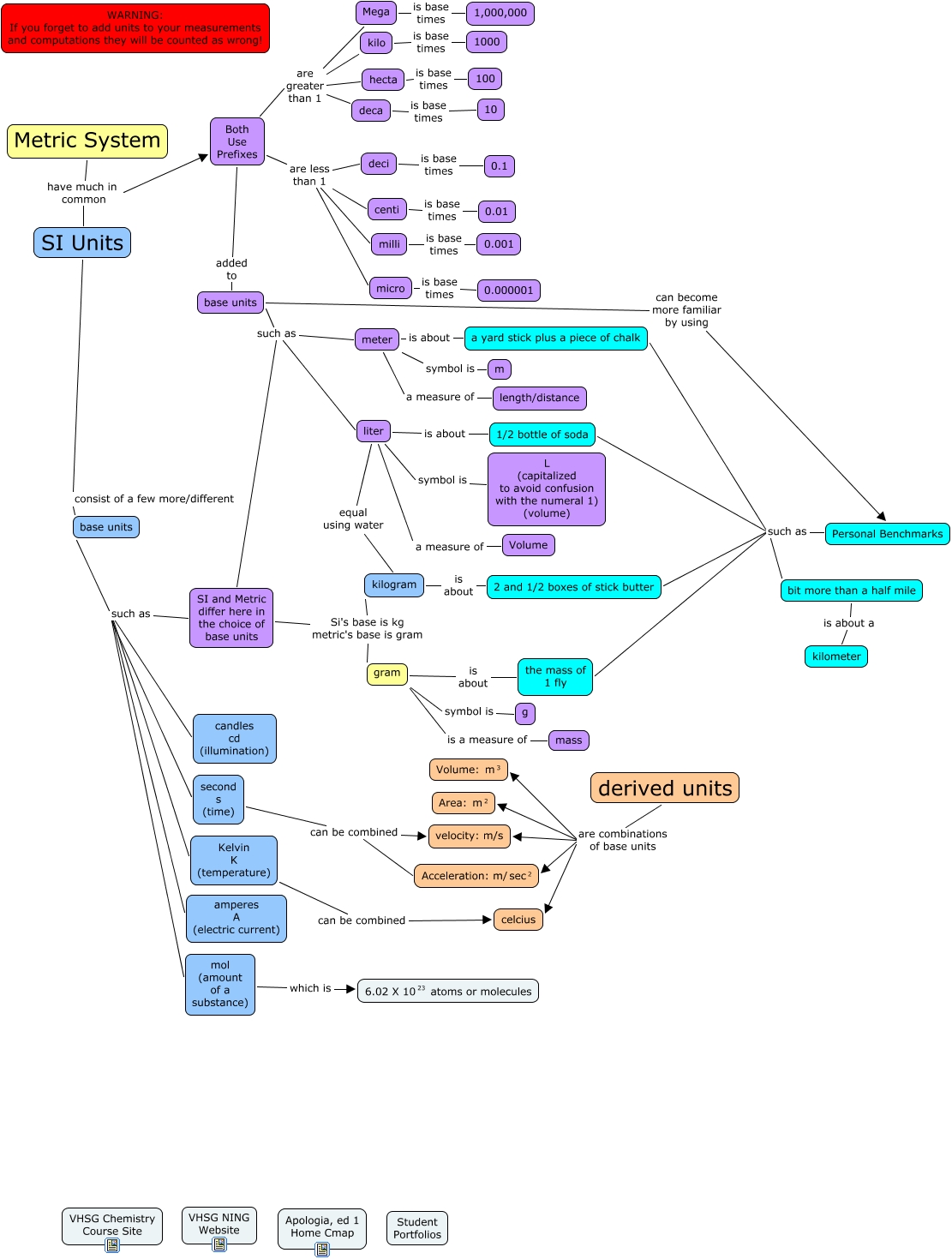 This Concept Map, created with IHMC CmapTools, has information related to: Metric and SI Units, Mega is base times 1,000,000, second s (time) can be combined <math xmlns="http://www.w3.org/1998/Math/MathML"> <mrow> <mtext> Acceleration: m/ </mtext> <mmultiscripts> <mtext> sec </mtext> <none/> <mtext> 2 </mtext> </mmultiscripts> </mrow> </math>, SI and Metric differ here in the choice of base units Si's base is kg metric's base is gram gram, base units such as candles cd (illumination), derived units are combinations of base units <math xmlns="http://www.w3.org/1998/Math/MathML"> <mrow> <mtext> Volume: </mtext> <mmultiscripts> <mtext> m </mtext> <none/> <mtext> 3 </mtext> </mmultiscripts> </mrow> </math>, base units can become more familiar by using Personal Benchmarks, liter is about 1/2 bottle of soda, SI Units have much in common Metric System, Personal Benchmarks such as 1/2 bottle of soda, base units such as SI and Metric differ here in the choice of base units, mol (amount of a substance) which is <math xmlns="http://www.w3.org/1998/Math/MathML"> <mrow> <mmultiscripts> <mtext> 6.02 X 10 </mtext> <none/> <mtext> 23 </mtext> </mmultiscripts> <mtext> atoms or molecules </mtext> </mrow> </math>, base units such as SI and Metric differ here in the choice of base units, meter is about a yard stick plus a piece of chalk, derived units are combinations of base units <math xmlns="http://www.w3.org/1998/Math/MathML"> <mrow> <mtext> Acceleration: m/ </mtext> <mmultiscripts> <mtext> sec </mtext> <none/> <mtext> 2 </mtext> </mmultiscripts> </mrow> </math>, Personal Benchmarks such as 2 and 1/2 boxes of stick butter, derived units are combinations of base units celcius, derived units are combinations of base units velocity: m/s, meter a measure of length/distance, milli is base times 0.001, gram symbol is g