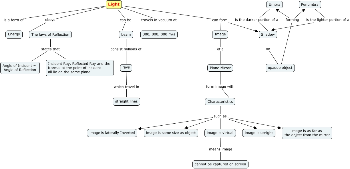This Concept Map, created with IHMC CmapTools, has information related to: Light (cmap model), Light travels in vacuum at 300, 000, 000 m/s, Characteristics such as image is same size as object, Characteristics such as image is virtual, The laws of Reflection states that Incident Ray, Reflected Ray and the Normal at the point of incident all lie on the same plane, Penumbra is the lighter portion of a Shadow, beam consist millions of rays, Characteristics such as image is upright, Image of a Plane Mirror, Plane Mirror form image with Characteristics, The laws of Reflection states that Angle of Incident = Angle of Reflection, opaque object forming Umbra, Characteristics such as image is as far as the object from the mirror, Characteristics such as image is laterally Inverted, Light obeys The laws of Reflection, Light can form Image, opaque object forming Penumbra, Light is a form of Energy, Shadow on opaque object, Light can form Shadow, Light can be beam