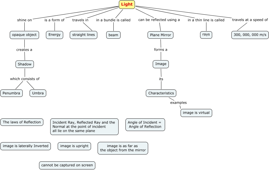 This Concept Map, created with IHMC CmapTools, has information related to: Light (parking LOTs), Light in a bundle is called beam, opaque object creates a Shadow, Characteristics examples image is virtual, Image its Characteristics, Light travels at a speed of 300, 000, 000 m/s, Shadow which consists of Umbra, Plane Mirror forms a Image, Light can be reflected using a Plane Mirror, Light shine on opaque object, Light in a thin line is called rays, Light travels in straight lines, Light is a form of Energy, Shadow which consists of Penumbra
