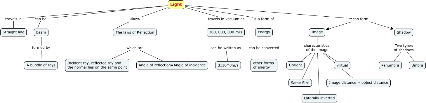This Concept Map, created with IHMC CmapTools, has information related to: Light (skeletol), Image characteristics of the image Upright, The laws of Reflection which are Incident ray, reflected ray and the normal lies on the same point, Light travels in vacuum at 300, 000, 000 m/s, Light is a form of Energy, Image characteristics of the image Laterally inverted, Shadow Two types of shadows Penumbra, Shadow Two types of shadows Umbra, Light travels in Straight line, The laws of Reflection which are Angle of reflection=Angle of incidence, Light can form Shadow, Energy can be converted other forms of energy, Image characteristics of the image virtual, Light can be beam, Image characteristics of the image Same Size, 300, 000, 000 m/s can be written as 3x10^8m/s, Image characteristics of the image Image distance = object distance, beam formed by A bundle of rays, Light obeys The laws of Reflection, Light can form Image