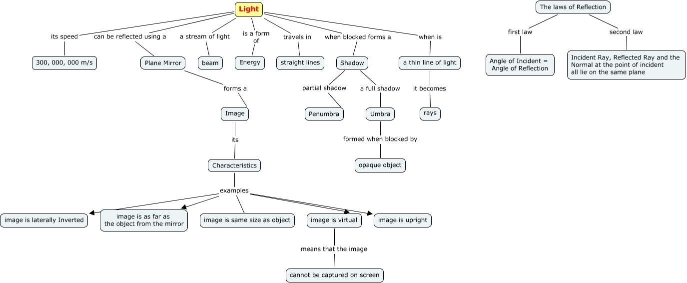 This Concept Map, created with IHMC CmapTools, has information related to: Light (parking LOTs), Characteristics examples image is upright, image is virtual means that the image cannot be captured on screen, Light when is a thin line of light, Light its speed 300, 000, 000 m/s, The laws of Reflection second law Incident Ray, Reflected Ray and the Normal at the point of incident all lie on the same plane, The laws of Reflection first law Angle of Incident = Angle of Reflection, Characteristics examples image is laterally Inverted, Characteristics examples image is same size as object, Characteristics examples image is virtual, Light can be reflected using a Plane Mirror, Umbra formed when blocked by opaque object, Shadow partial shadow Penumbra, Shadow a full shadow Umbra, Light when blocked forms a Shadow, Image its Characteristics, Plane Mirror forms a Image, Characteristics examples image is as far as the object from the mirror, a thin line of light it becomes rays, Light a stream of light beam, Light is a form of Energy