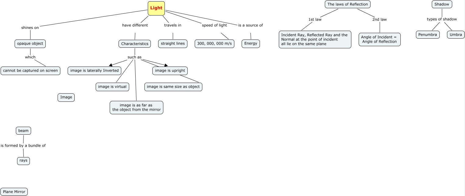 This Concept Map, created with IHMC CmapTools, has information related to: Light (parking LOTs), Characteristics such as image is laterally Inverted, Characteristics such as image is same size as object, beam is formed by a bundle of rays, The laws of Reflection 2nd law Angle of Incident = Angle of Reflection, The laws of Reflection 1st law Incident Ray, Reflected Ray and the Normal at the point of incident all lie on the same plane, Characteristics such as image is upright, Characteristics such as image is virtual, opaque object which cannot be captured on screen, Light shines on opaque object, Light speed of light 300, 000, 000 m/s, Shadow types of shadow Penumbra, Shadow types of shadow Umbra, Light have different Characteristics, Characteristics such as image is as far as the object from the mirror, Light is a source of Energy, Light travels in straight lines