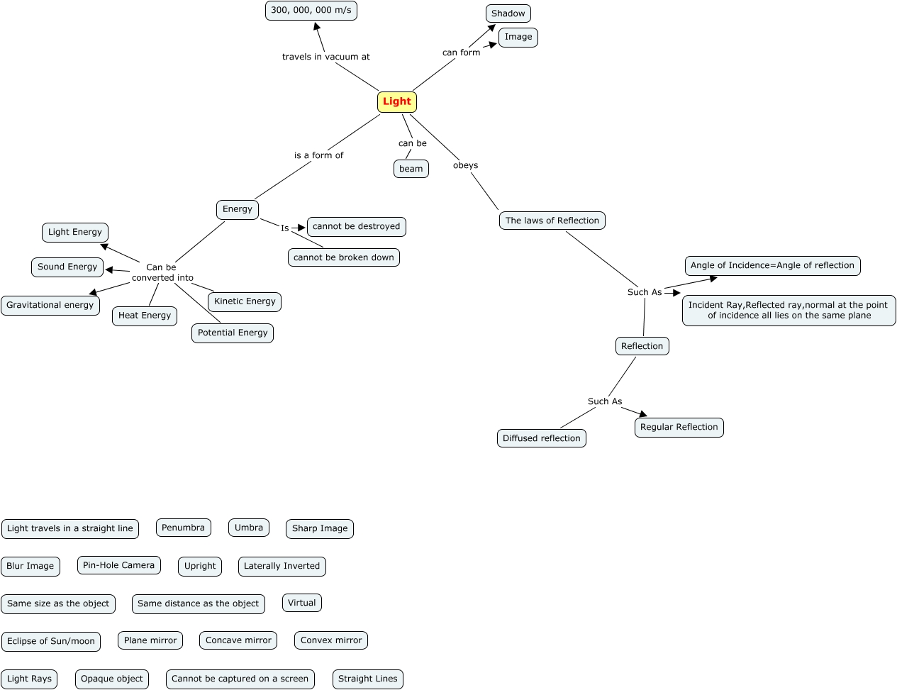This Concept Map, created with IHMC CmapTools, has information related to: Light (skeletol), The laws of Reflection Such As Angle of Incidence=Angle of reflection, Energy Can be converted into Light Energy, Light travels in vacuum at 300, 000, 000 m/s, Light is a form of Energy, Energy Can be converted into Gravitational energy, Energy Can be converted into Potential Energy, Light can form Shadow, The laws of Reflection Such As Incident Ray,Reflected ray,normal at the point of incidence all lies on the same plane, Energy Can be converted into Heat Energy, Light can be beam, Energy Is cannot be destroyed, Reflection Such As Regular Reflection, The laws of Reflection Such As Reflection, Energy Can be converted into Kinetic Energy, Energy Can be converted into Sound Energy, Light can form Image, Reflection Such As Diffused reflection, Light obeys The laws of Reflection, Energy Is cannot be broken down