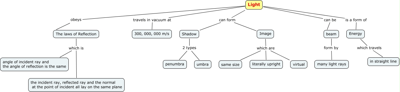 This Concept Map, created with IHMC CmapTools, has information related to: Light (skeletol), Light is a form of Energy, Shadow 2 types umbra, The laws of Reflection which is angle of incident ray and the angle of reflection is the same, Light can form Shadow, beam form by many light rays, Light can form Image, Light can be beam, Image which are virtual, The laws of Reflection which is the incident ray, reflected ray and the normal at the point of incident all lay on the same plane, Energy which travels in straight line, Light travels in vacuum at 300, 000, 000 m/s, Image which are literally upright, Shadow 2 types penumbra, Light obeys The laws of Reflection, Image which are same size