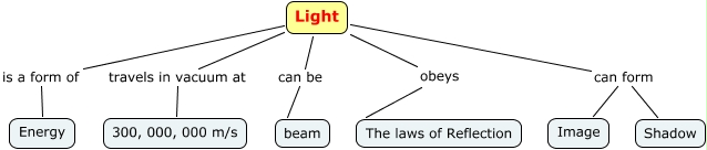 This Concept Map, created with IHMC CmapTools, has information related to: Light (skeletol), Light is a form of Energy, Light travels in vacuum at 300, 000, 000 m/s, Light can form Shadow, Light can be beam, Light can form Image, Light obeys The laws of Reflection