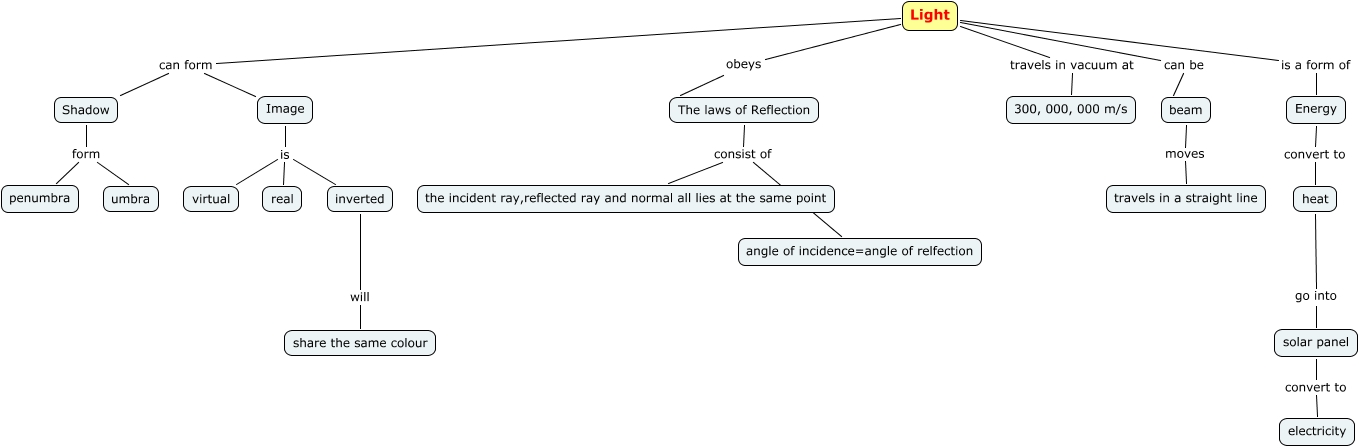 This Concept Map, created with IHMC CmapTools, has information related to: Light (skeletol), The laws of Reflection consist of the incident ray,reflected ray and normal all lies at the same point, Shadow form umbra, Light travels in vacuum at 300, 000, 000 m/s, Light is a form of Energy, beam moves travels in a straight line, The laws of Reflection consist of angle of incidence=angle of relfection, Image is real, Image is inverted, Light can form Shadow, Energy convert to heat, Light can be beam, inverted will share the same colour, Image is virtual, Shadow form penumbra, heat go into solar panel, solar panel convert to electricity, Light obeys The laws of Reflection, Light can form Image