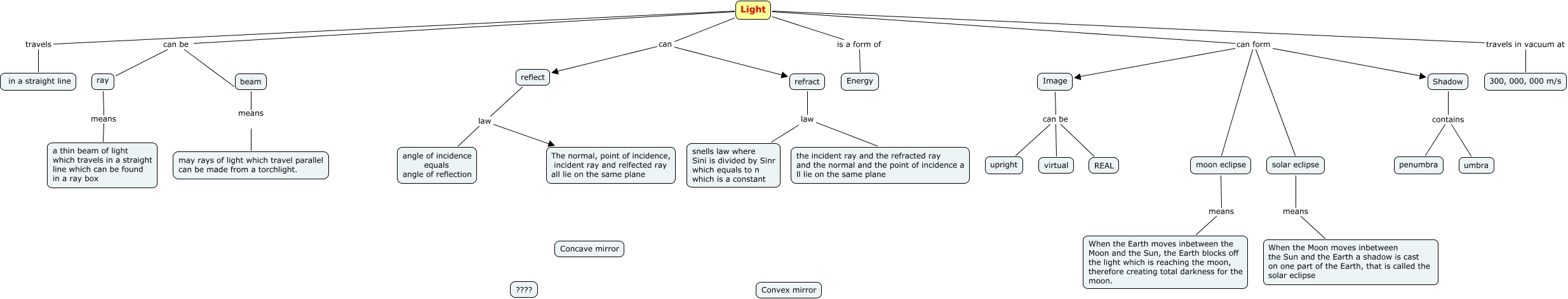 This Concept Map, created with IHMC CmapTools, has information related to: Light (skeletol), Image can be REAL, Light travels in a straight line, Light travels in vacuum at 300, 000, 000 m/s, Light is a form of Energy, Light can form Shadow, Light can form moon eclipse, Image can be virtual, Shadow contains penumbra, refract law snells law where Sini is divided by Sinr which equals to n which is a constant, Light can refract, Light can be ray, Light can be beam, Light can form solar eclipse, Shadow contains umbra, refract law the incident ray and the refracted ray and the normal and the point of incidence a ll lie on the same plane, Light can reflect, reflect law The normal, point of incidence, incident ray and relfected ray all lie on the same plane, moon eclipse means When the Earth moves inbetween the Moon and the Sun, the Earth blocks off the light which is reaching the moon, therefore creating total darkness for the moon., reflect law angle of incidence equals angle of reflection, Light can form Image