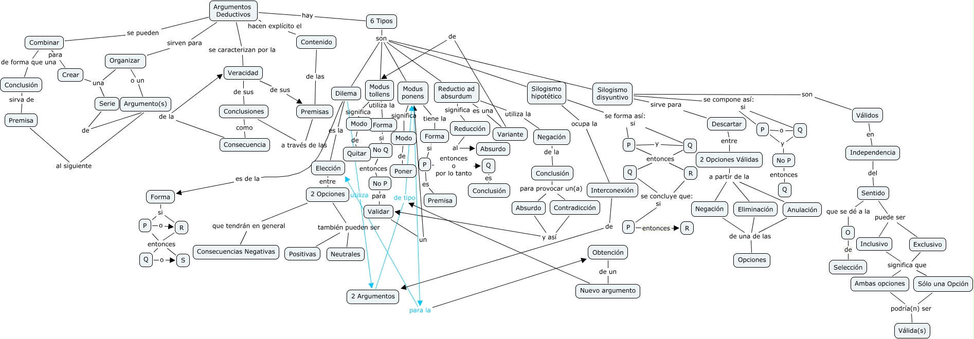 This Concept Map, created with IHMC CmapTools, has information related to: Argumentos deductivos, Silogismo hipotético ocupa la Interconexión, 2 Opciones también pueden ser Neutrales, No P entonces Q, P entonces Q, Validar un Modus ponens, Válidos en Independencia, 2 Opciones también pueden ser Positivas, P entonces R, Argumentos Deductivos hacen explícito el Contenido, Q o S, Dilema es de la Forma, Silogismo hipotético se forma así: si Q, Organizar una Serie, Consecuencia de la Veracidad, Forma si P, Forma si P, Q entonces Q, Q y No P, Premisa al siguiente Argumento(s), Silogismo disyuntivo son Válidos
