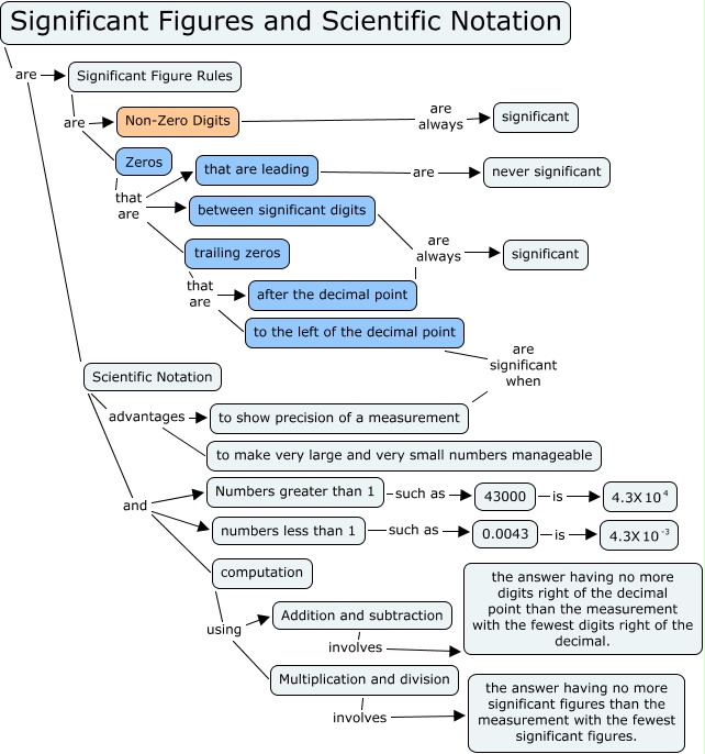 This Concept Map, created with IHMC CmapTools, has information related to: Significant Figures and Scientific Notation, Scientific Notation and numbers less than 1, Numbers greater than 1 such as 43000, Scientific Notation advantages to show precision of a measurement, computation using Addition and subtraction, that are leading are never significant, Non-Zero Digits are always significant, Multiplication and division involves the answer having no more significant figures than the measurement with the fewest significant figures., Significant Figure Rules are Zeros, Zeros that are between significant digits, Scientific Notation and computation, between significant digits are always significant, Significant Figure Rules are Non-Zero Digits, Significant Figures and Scientific Notation are Scientific Notation, Scientific Notation advantages to make very large and very small numbers manageable, to the left of the decimal point are significant when to show precision of a measurement, after the decimal point are always significant, numbers less than 1 such as 0.0043, Zeros that are trailing zeros, 43000 is <math xmlns="http://www.w3.org/1998/Math/MathML"> <mrow> <mtext> 4.3X </mtext> <mmultiscripts> <mtext> 10 </mtext> <none/> <mtext> 4 </mtext> </mmultiscripts> </mrow> </math>, Zeros that are that are leading