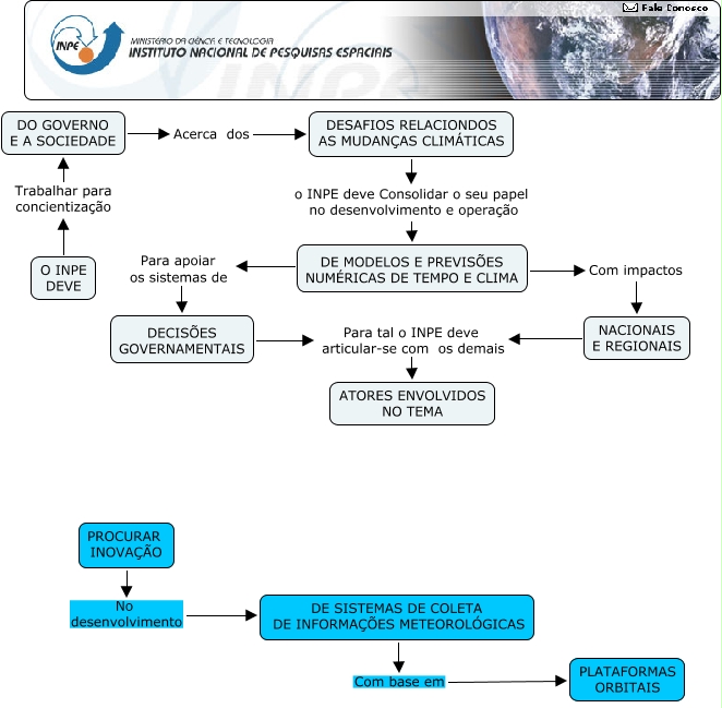 This Concept Map, created with IHMC CmapTools, has information related to: Mudanças Climáticas, DESAFIOS RELACIONDOS AS MUDANÇAS CLIMÁTICAS o INPE deve Consolidar o seu papel no desenvolvimento e operação DE MODELOS E PREVISÕES NUMÉRICAS DE TEMPO E CLIMA, DO GOVERNO E A SOCIEDADE Acerca dos DESAFIOS RELACIONDOS AS MUDANÇAS CLIMÁTICAS, DECISÕES GOVERNAMENTAIS Para tal o INPE deve articular-se com os demais ATORES ENVOLVIDOS NO TEMA, DE MODELOS E PREVISÕES NUMÉRICAS DE TEMPO E CLIMA Com impactos NACIONAIS E REGIONAIS, DE SISTEMAS DE COLETA DE INFORMAÇÕES METEOROLÓGICAS Com base em PLATAFORMAS ORBITAIS, PROCURAR INOVAÇÃO No desenvolvimento DE SISTEMAS DE COLETA DE INFORMAÇÕES METEOROLÓGICAS, NACIONAIS E REGIONAIS Para tal o INPE deve articular-se com os demais ATORES ENVOLVIDOS NO TEMA, O INPE DEVE Trabalhar para concientização DO GOVERNO E A SOCIEDADE, DE MODELOS E PREVISÕES NUMÉRICAS DE TEMPO E CLIMA Para apoiar os sistemas de DECISÕES GOVERNAMENTAIS