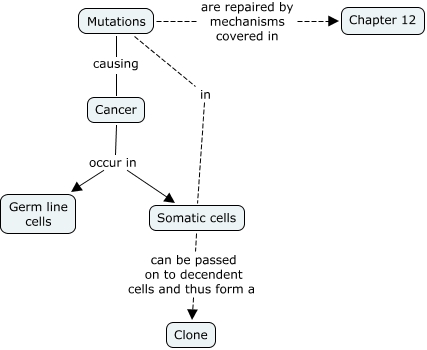 This Concept Map, created with IHMC CmapTools, has information related to: How-to-Chapter1-5, Mutations causing Cancer, Cancer occur in Somatic cells, Mutations in Somatic cells, Somatic cells can be passed on to decendent cells and thus form a Clone, Cancer occur in Germ line cells, Mutations are repaired by mechanisms covered in Chapter 12