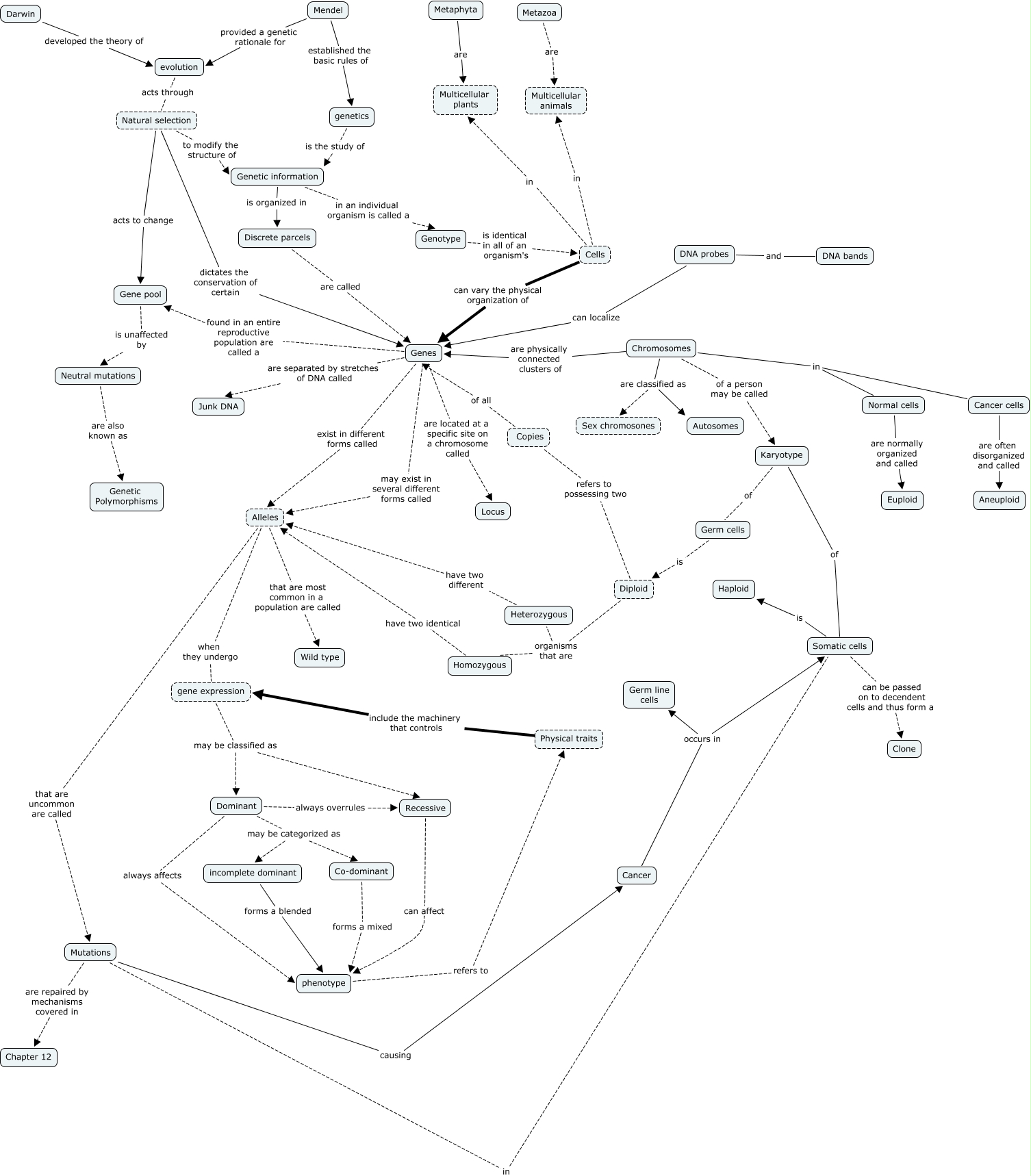 This Concept Map, created with IHMC CmapTools, has information related to: Chapter1 merge 1-5, Homozygous have two identical Alleles, Mutations causing Cancer, Genes exist in different forms called Alleles, Somatic cells is Haploid, gene expression may be classified as Recessive, Germ cells is Diploid, Recessive can affect phenotype, Cells can vary the physical organization of Genes, incomplete dominant forms a blended phenotype, Cells in Multicellular plants, Co-dominant forms a mixed phenotype, Heterozygous have two different Alleles, DNA bands and DNA probes, Discrete parcels are called Genes, Normal cells are normally organized and called Euploid, Mutations in Somatic cells, Karyotype of Somatic cells, Dominant always overrules Recessive, Chromosomes are classified as Sex chromosones, Natural selection dictates the conservation of certain Genes