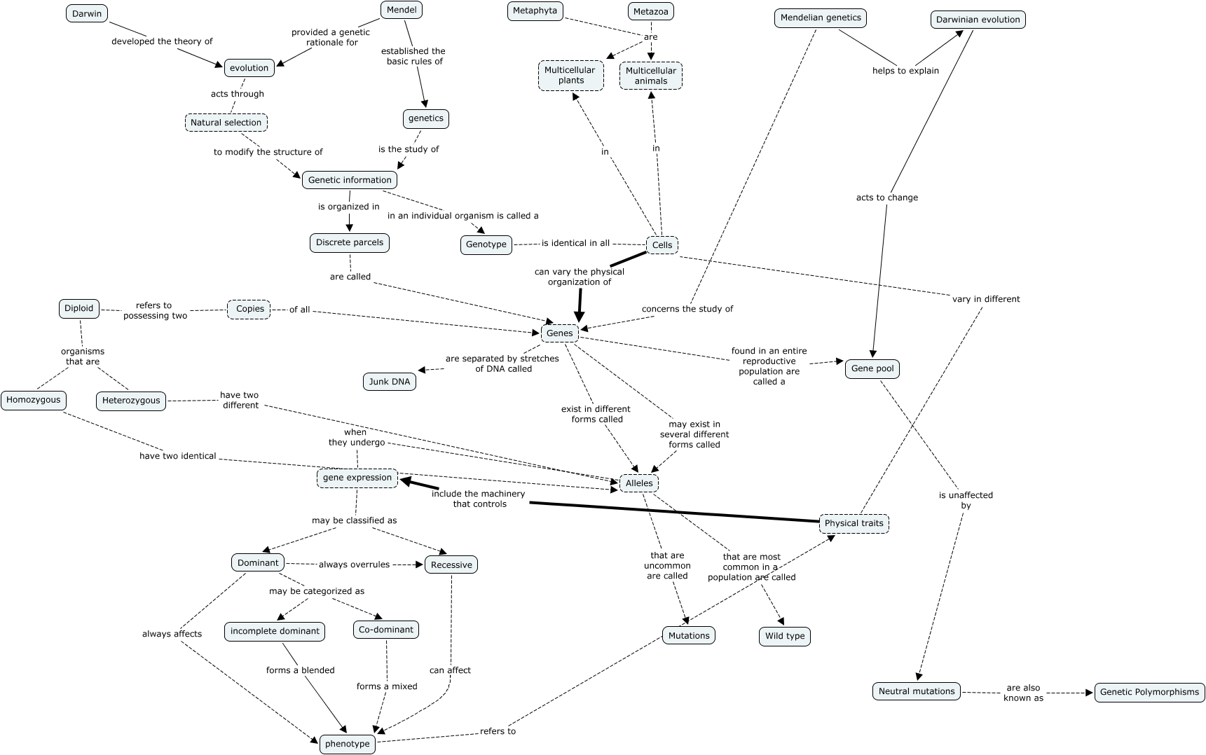 This Concept Map, created with IHMC CmapTools, has information related to: Chapter1 merge, Genetic information in an individual organism is called a Genotype, Alleles that are uncommon are called Mutations, Darwin developed the theory of evolution, Mendelian genetics concerns the study of Genes, Homozygous have two identical Alleles, Genes found in an entire reproductive population are called a Gene pool, phenotype refers to Physical traits, Diploid organisms that are Homozygous, Alleles when they undergo gene expression, Heterozygous have two different Alleles, Genetic information is organized in Discrete parcels, Diploid refers to possessing two Copies, Metazoa are Multicellular plants, Mendelian genetics helps to explain Darwinian evolution, Cells in Multicellular animals, Dominant may be categorized as Co-dominant, Gene pool is unaffected by Neutral mutations, Dominant always overrules Recessive, Cells can vary the physical organization of Genes, Diploid organisms that are Heterozygous