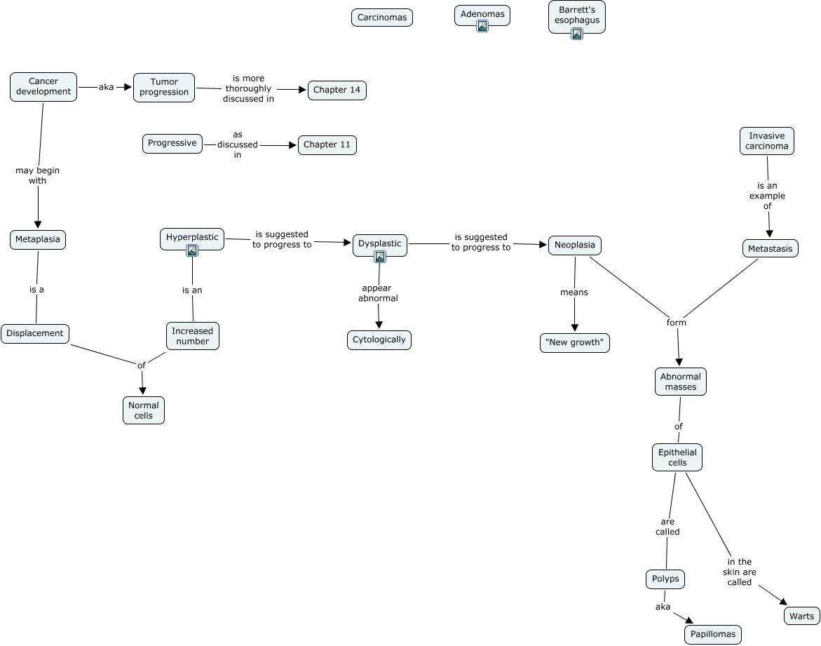 This Concept Map, created with IHMC CmapTools, has information related to: Chapter 2-04 partial map, Tumor progression is more thoroughly discussed in Chapter 14, Dysplastic appear abnormal Cytologically, Metastasis form Abnormal masses, Hyperplastic is suggested to progress to Dysplastic, Progressive as discussed in Chapter 11, Epithelial cells are called Polyps, Neoplasia means "New growth", Hyperplastic is an Increased number, Increased number of Normal cells, Cancer development aka Tumor progression, Epithelial cells in the skin are called Warts, Neoplasia form Abnormal masses, Abnormal masses of Epithelial cells, Cancer development may begin with Metaplasia, Dysplastic is suggested to progress to Neoplasia, Metaplasia is a Displacement, Polyps aka Papillomas, Displacement of Normal cells, Invasive carcinoma is an example of Metastasis