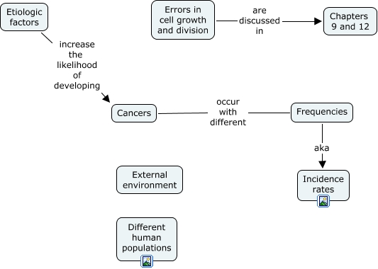 This Concept Map, created with IHMC CmapTools, has information related to: Chapter 2-06 partial map, Errors in cell growth and division are discussed in Chapters 9 and 12, Cancers occur with different Frequencies, Frequencies aka Incidence rates, Etiologic factors increase the likelihood of developing Cancers