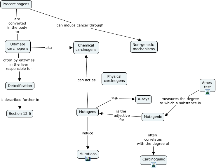 This Concept Map, created with IHMC CmapTools, has information related to: Chapter 2-09 partial map, Ultimate carcinogens aka Chemical carcinogens, Procarcinogens are converted in the body to Ultimate carcinogens, Mutagens induce Mutations, Detoxification is described further in Section 12.6, Procarcinogens can induce cancer through Non-genetic mechanisms, Ultimate carcinogens often by enzymes in the liver responsible for Detoxification, Mutagenic is the adjective for Mutagens, Physical carcinogens e.g. X-rays, Mutagens e.g. X-rays, Ames test measures the degree to which a substance is Mutagenic, Mutagenic often correlates with the degree of Carcinogenic, Mutagens can act as Chemical carcinogens