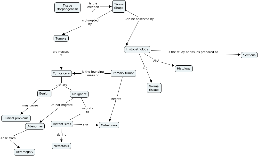 This Concept Map, created with IHMC CmapTools, has information related to: Chapter 2.1, Histopathology e.g. Normal tissues, Malignant Do not migrate Adenomas, Adenomas Arise from Acromegaly, Tissue Shape is disrupted by Tumors, Histopathology Is the study of tissues prepared as Sections, Distant sites during Metastasis, Tumor cells that are Benign, Tissue Shape Can be observed by Histopathology, Tumor cells that are Malignant, Tissue Morphogenesis is the creation of Tissue Shape, Tumors are masses of Tumor cells, Distant sites aka Metastases, Histopathology AKA Histology, Primary tumor is the founding mass of Tumor cells, Benign may cause Clinical problems, Malignant migrate to Distant sites, Primary tumor begets Metastases