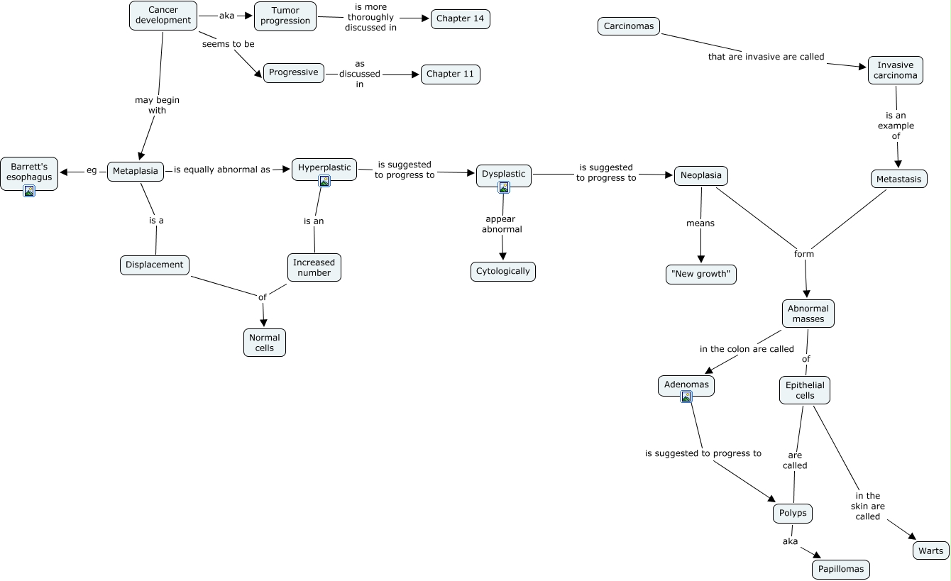 This Concept Map, created with IHMC CmapTools, has information related to: Chapter 2-4 complete map, Tumor progression is more thoroughly discussed in Chapter 14, Dysplastic appear abnormal Cytologically, Carcinomas that are invasive are called Invasive carcinoma, Metastasis form Abnormal masses, Hyperplastic is suggested to progress to Dysplastic, Progressive as discussed in Chapter 11, Epithelial cells are called Polyps, Abnormal masses in the colon are called Adenomas, Neoplasia means "New growth", Hyperplastic is an Increased number, Metaplasia eg Barrett's esophagus, Increased number of Normal cells, Cancer development aka Tumor progression, Cancer development seems to be Progressive, Epithelial cells in the skin are called Warts, Neoplasia form Abnormal masses, Abnormal masses of Epithelial cells, Cancer development may begin with Metaplasia, Dysplastic is suggested to progress to Neoplasia, Metaplasia is a Displacement