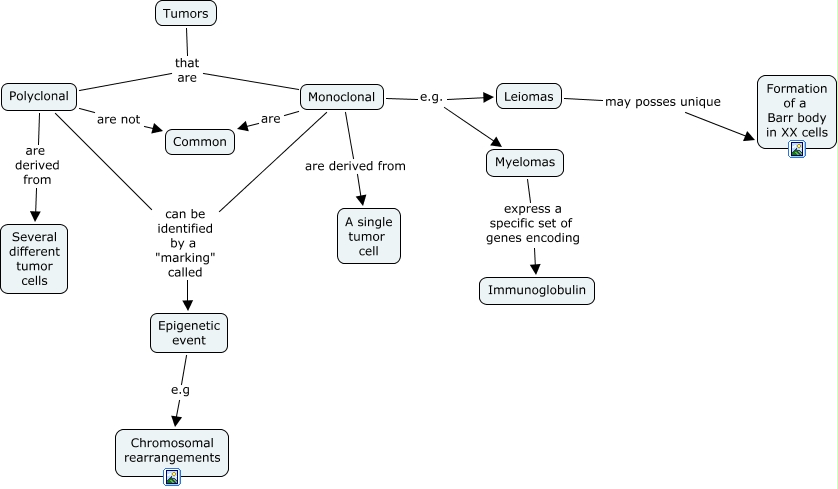 This Concept Map, created with IHMC CmapTools, has information related to: chapter 2-5 complete map, Leiomas may posses unique Formation of a Barr body in XX cells, Monoclonal are derived from A single tumor cell, Epigenetic event e.g Chromosomal rearrangements, Monoclonal e.g. Leiomas, Monoclonal can be identified by a "marking" called Epigenetic event, Polyclonal can be identified by a "marking" called Epigenetic event, Polyclonal are not Common, Myelomas express a specific set of genes encoding Immunoglobulin, Monoclonal e.g. Myelomas, Polyclonal are derived from Several different tumor cells, Tumors that are Polyclonal, Monoclonal are Common, Tumors that are Monoclonal