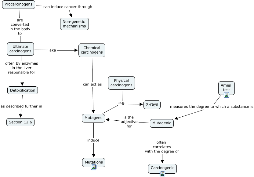 This Concept Map, created with IHMC CmapTools, has information related to: Chapter 2-9 completel map, Detoxification as described further in Section 12.6, Mutagens induce Mutations, Procarcinogens are converted in the body to Ultimate carcinogens, Ultimate carcinogens aka Chemical carcinogens, Procarcinogens can induce cancer through Non-genetic mechanisms, Ames test measures the degree to which a substance is Mutagenic, Mutagens e.g. X-rays, Physical carcinogens e.g. X-rays, Mutagenic is the adjective for Mutagens, Ultimate carcinogens often by enzymes in the liver responsible for Detoxification, Chemical carcinogens can act as Mutagens, Mutagenic often correlates with the degree of Carcinogenic