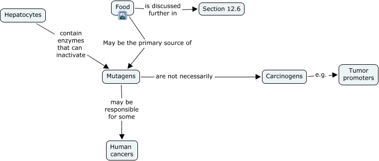 This Concept Map, created with IHMC CmapTools, has information related to: Chapter 2-10 complete, Carcinogens e.g. Tumor promoters, Mutagens are not necessarily Carcinogens, Food is discussed further in Section 12.6, Food May be the primary source of Mutagens, Hepatocytes contain enzymes that can inactivate Mutagens, Mutagens may be responsible for some Human cancers