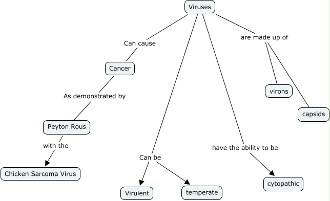 This Concept Map, created with IHMC CmapTools, has information related to: chapter 3-1, Viruses have the ability to be cytopathic, Viruses are made up of capsids, Viruses Can cause Cancer, Viruses Can be temperate, Viruses are made up of virons, Viruses Can be Virulent, Peyton Rous with the Chicken Sarcoma Virus, Cancer As demonstrated by Peyton Rous