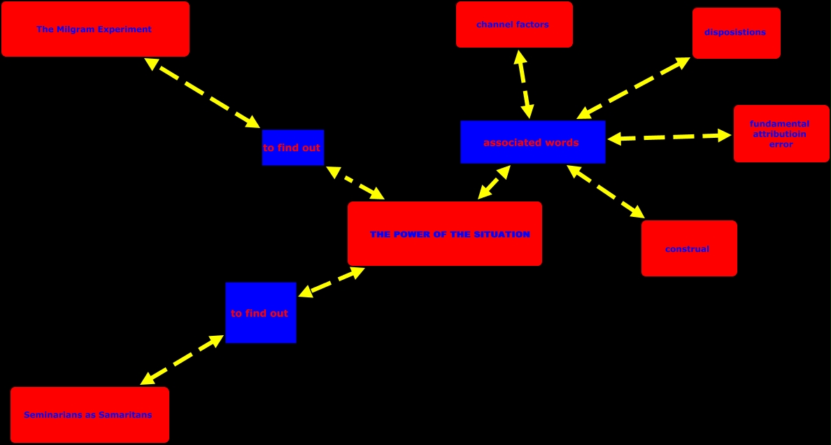 This Concept Map, created with IHMC CmapTools, has information related to: situation, THE POWER OF THE SITUATION associated words channel factors, THE POWER OF THE SITUATION associated words fundamental attributioin error, THE POWER OF THE SITUATION to find out The Milgram Experiment, THE POWER OF THE SITUATION to find out Seminarians as Samaritans, THE POWER OF THE SITUATION associated words disposistions, THE POWER OF THE SITUATION associated words construal
