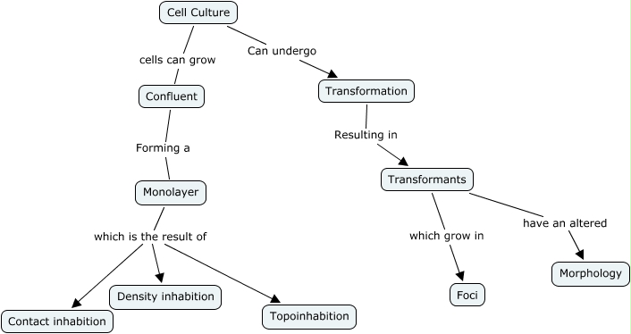 This Concept Map, created with IHMC CmapTools, has information related to: Chapter 3-2, Transformants which grow in Foci, Monolayer which is the result of Contact inhabition, Cell Culture Can undergo Transformation, Monolayer which is the result of Topoinhabition, Cell Culture cells can grow Confluent, Confluent Forming a Monolayer, Transformants have an altered Morphology, Transformation Resulting in Transformants, Monolayer which is the result of Density inhabition