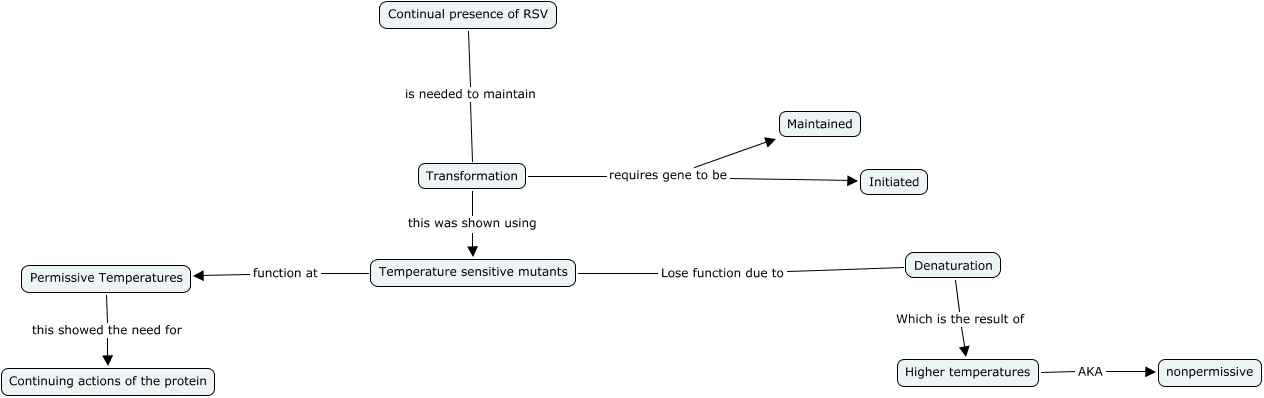 This Concept Map, created with IHMC CmapTools, has information related to: Section 3-3, Temperature sensitive mutants function at Permissive Temperatures, Permissive Temperatures this showed the need for Continuing actions of the protein, Transformation this was shown using Temperature sensitive mutants, Transformation requires gene to be Maintained, Continual presence of RSV is needed to maintain Transformation, Temperature sensitive mutants Lose function due to Denaturation, Transformation requires gene to be Initiated, Denaturation Which is the result of Higher temperatures, Higher temperatures AKA nonpermissive