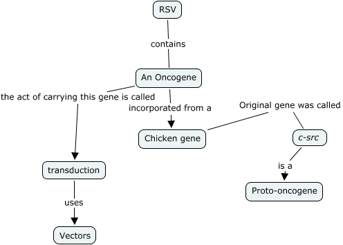 This Concept Map, created with IHMC CmapTools, has information related to: Chapter 3-9, Chicken gene Original gene was called c-src, An Oncogene the act of carrying this gene is called transduction, An Oncogene incorporated from a Chicken gene, RSV contains An Oncogene, c-src is a Proto-oncogene, transduction uses Vectors
