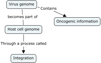 This Concept Map, created with IHMC CmapTools, has information related to: Chapter 3-6, Virus genome Contains Oncogenic information, Virus genome becomes part of Host cell genome, Host cell genome Through a process called Integration
